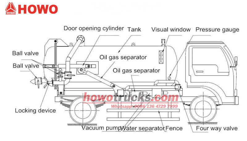 Vakuumska pumpa stvara negativni tlak, usisavajući otpadne vode, mulj i druge onečišćujuće tvari u zatvoreni spremnik otpadnih voda putem usisnog crijeva. Spremnik je opremljen uređajem za sprječavanje prelijevanja kako bi se spriječio povratni tok otpadnih voda. komplet karoserije cisterne za čišćenje odvodnje opremljen je mjeračem razine i manometrom kako bi se osigurao učinkovit i siguran rad.