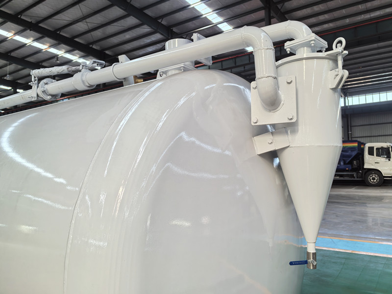 ●Komplet karoserije cisterne za čišćenje odvodnje od 10 CBM prvenstveno se sastoji od tijela vakuumskog spremnika, sustava vakuumske pumpe, cjevovodnog sustava, hidrauličkog sustava i električnog upravljačkog sustava. Tijelo spremnika zavareno je od visokokvalitetnog ugljičnog čelika, a unutrašnjost je obrađena antikorozivnim tretmanom, što osigurava izvrsno brtvljenje i otpornost na koroziju.