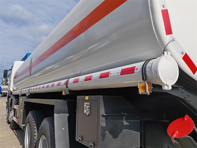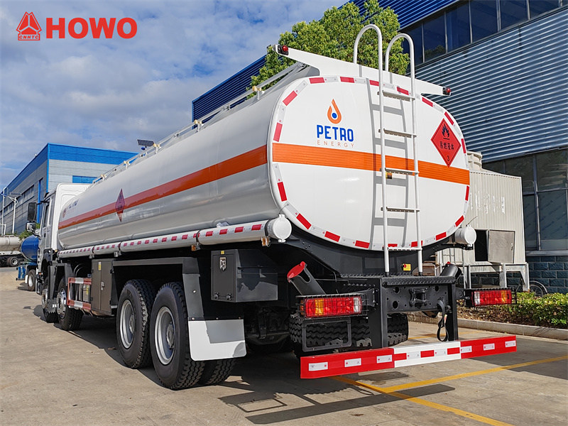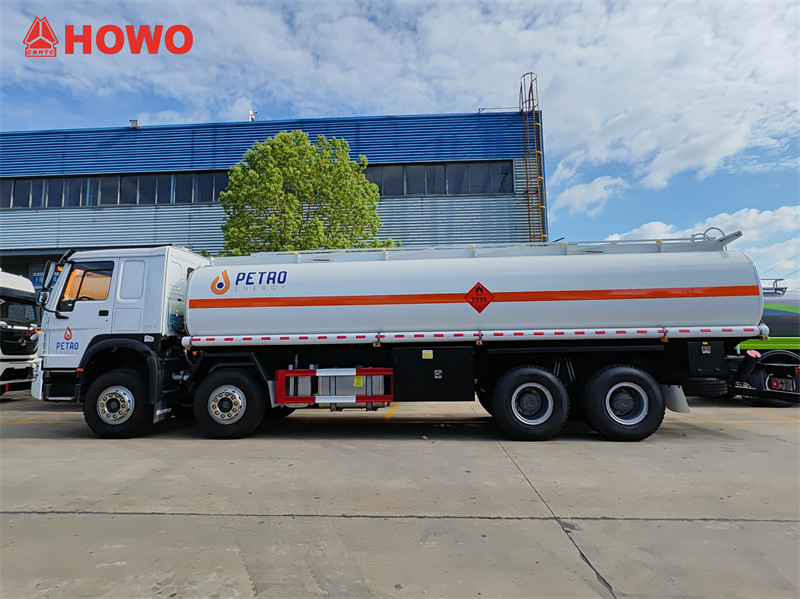 Sinotruk HOWO 8x4 kamion cisterna za naftu od 25 CBM, koristi šasiju kabine Sinotruk HW76, pogon 8x4, međuosovinski razmak 1800+4625+1350 mm, opremljen motorom Sinotruk WD615.47, mjenjačem HW19710, gornji dio je spremnik za ulje od ugljičnog čelika od 25 kubičnih metara, sa 6 odjeljaka, koji primaju 3, 4, 4, 4, 5, 5 kubičnih metara, svaki opremljen europskim standardnim šahtom, donjim ventilom, ventilom za istovar ulja, gornjom stazom, rukohvatom, 1 ventilom za nuždu, 2 cijevi za istovar ulja.