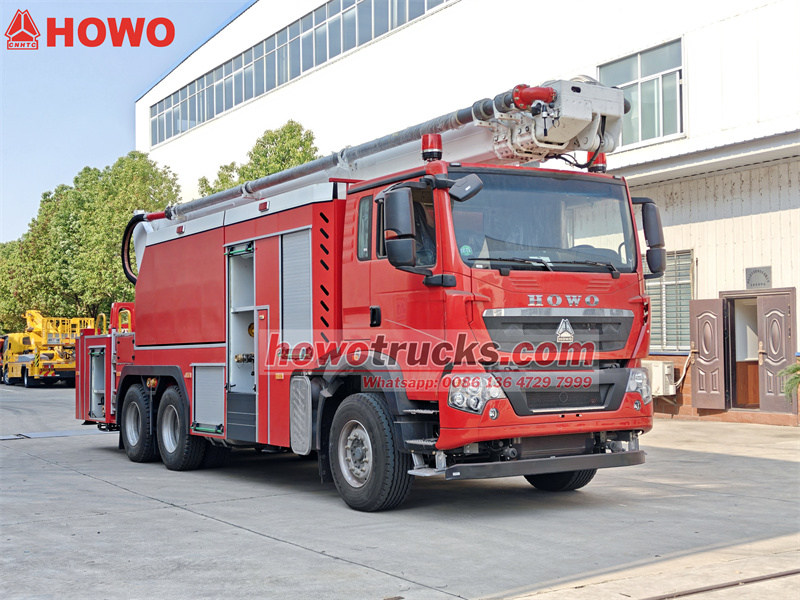 Howo 6x4 vatrogasna vozila visokog dosega voda Kamion ima kompaktnu strukturu, malu veličinu, veliku operativnu prilagodljivost, fleksibilan rad te funkcije spašavanja i gašenja požara na velikim i malim visinama. Koristi Howo tešku 6x4 šasiju s jakom snagom i naprednom konfiguracijom. PTO je originalni prijenos snage šasije, koji ima najbolje usklađivanje snage. Podokvir ima strukturu u obliku kutije velikog presjeka s dobrom otpornošću na torziju, stabilizator ima strukturu u obliku slova H kratkog raspona, a ruka ima kombinaciju sklopivih ruku, koja se kreće brzo i glatko.