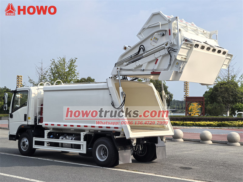 Kineski laki kamion Sinotruk HOWO sa stražnjim utovarivačem je profesionalno vozilo za odvoz smeća izgrađeno na šasiji lakih kamiona HOWO 4×2, opremljeno WEICHAI WP2.3NQ130E50 modelom 130KS, Euro 5P dizelskim motorom i WLY ručnim mjenjačem sa 6F i 1R. Kamion za smeće HOWO 8000L opremljen je karoserijom cisterne za kompaktor od 8cbm, a sve je bazirano na međunarodnom materijalu St52, ekvivalentnom materijalu Q355, debljine 4 mm za bočne strane i pod. Potpuno hidraulički radni uređaj za praktičan rad. Hidraulični cilindar za potisnu ploču, za stražnja vrata prtljažnika, za kliznu ploču, za strugač, za stražnji nagibni uređaj. Također je usklađen s CAN-BUS upravljačkim uređajem za jednostavno rukovanje.