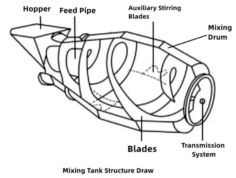2. Dizajn znanstvenog spremnika:Manganski čelik Q355 s dvostruko logaritamskom spiralnom krivuljom osigurava homogenost betona, minimizira ostatke i smanjuje otpad materijala.
