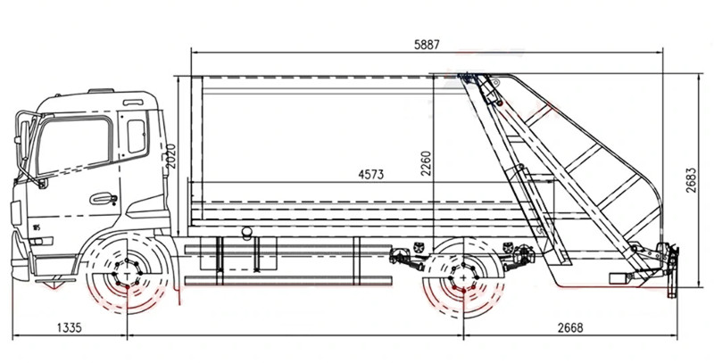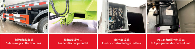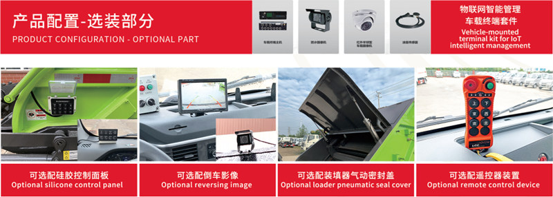 ●Vozilo je opremljeno mehanizmom za naginjanje straga, koji automatski naginje kante za smeće ili lijevke, šaljući smeće u komoru za kompresiju. Hidraulički potiskivači više puta komprimiraju smeće, smanjujući njegov volumen na otprilike jednu trećinu izvorne veličine, značajno povećavajući nosivost.